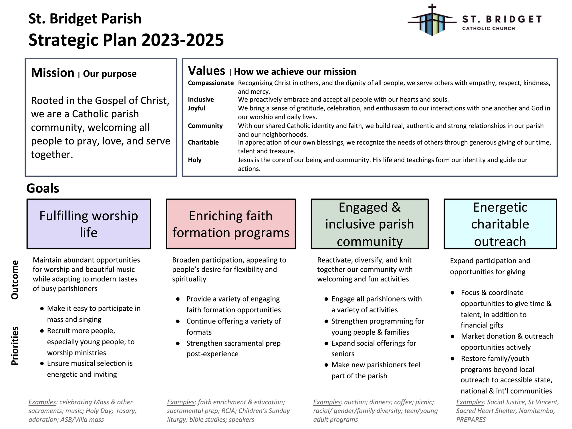 A parishioner-led strategic planning team worked collaboratively with the parish leadership teams, parish staff, and parishioners of St. Bridget to identify our parish community's core values and needs. The team gathered information, conducted workshops, and developed a strategic plan to move our parish forward in the next 5 years.
